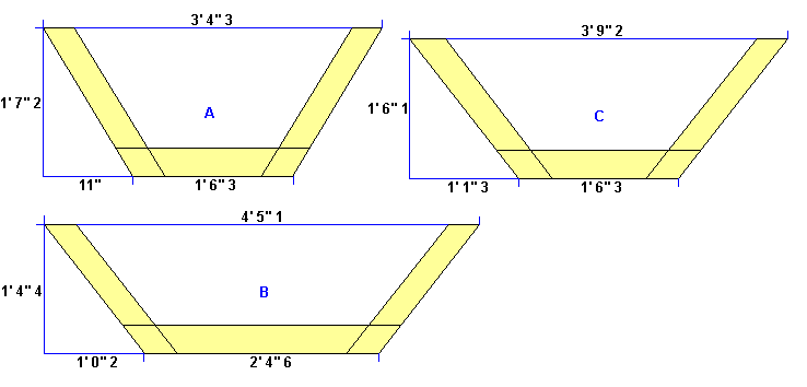 Measurements for the boat bottom. The plain measurements are for the butted version, the measurements in parentheses for the scarphed version.