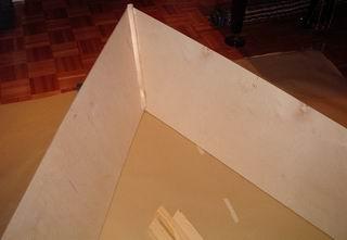 Kiinnitä kyljet liimalla ja ruuveilla keulapuuhun, joksi käy 55 cm pätkä 21 x 21 mm mäntyrimaa. Kylkien välinen kulma on 90 astetta, joten rima käy sellaisenaan. Yksinkertaista. Varmista, että kummankin levyn keulareunan särmä kulkee täsmälleen riman reunan suntaisesti, ja siis keskenään yhdensuuntaisesti.¨ Tästä lähtee tulevan veneen suoruus. |