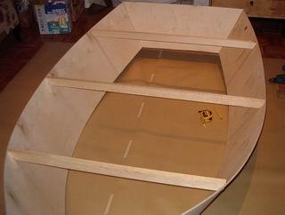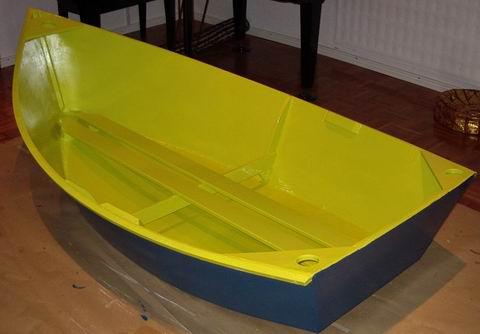Käännä vene oikein päin. Liimaa sisäpuoliset saumat epoksilla ja lasikuitunauhalla. Kun liima on kovettunut, käännä vene takaisin ylösalaisin, poista vanerilevyjen tilapäiset kiinnitysruuvit, kittaa ruuvien reijät paksunnetulla epoksilla ja liimaa saumat ulkopuolelta epoksilla ja lasikuitunauhalla. |