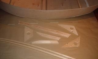 "Pikkutilpehöörit" valmiina kiinnitettäviksi. Tukikappaleet, soutupenkin tuet ja parraslistat. Miksi tukikappaleissa on 64 mm reikäsahalla tehdyt reijät?