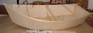 Aseta kyljet ja perälauta pohjavanerin päälle ja piirrä niiden ääriviivat pohjavaneriin. Kallista kylkiä eteenpäin keulan piirtämiseksi ja taaksepäin perän piirtämiseksi. Sahaa pohjalevy piirrettyjä ääriviivoja pitkin.. Käännä kylkirakennelma ylösalaisin. Ruuvaa pohjalevy kiinni kylkiin ja perälautaan, taas pienillä ruuveilla suoraan vanerin reunaan. |