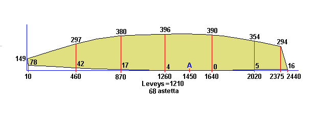 Tässäkin veneessä soutupenkin takalaita tulee pituussuunnassa merkin "A" alapuolelle.