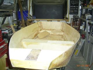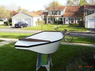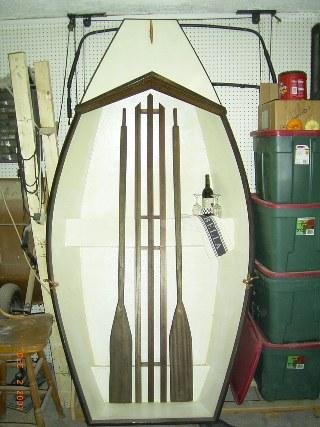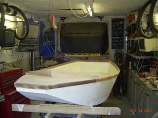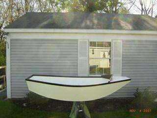Loved your web site. The last boat I built was 40 years ago with my uncle. I was the extra hands, sander, and most of all the "gofer". Enclosed are pictures of my progress. I made changes on the way by putting floatation under the conventional seats and forward deck, Gunwale battens, unconventional seating, deck trim and oars are mahogany. I sealed with three coats of white colored epoxy. Yes, over kill, just my nature. The wine is ready and now waiting for spring, six inches of snow today, she not an ice breaker. Total weight 43 lb and will be used as a tender for a Macgregor 26m purchased in the future.