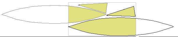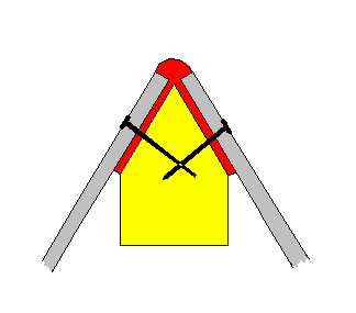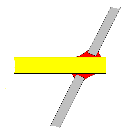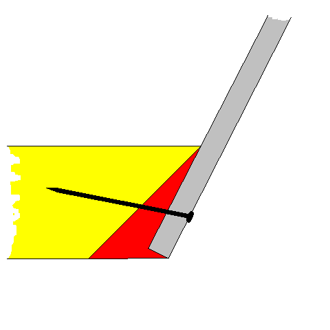 The plywood side (grey) nailed to the overbevelled bottom (yellow). The seam then filled with epoxy filler (red). |