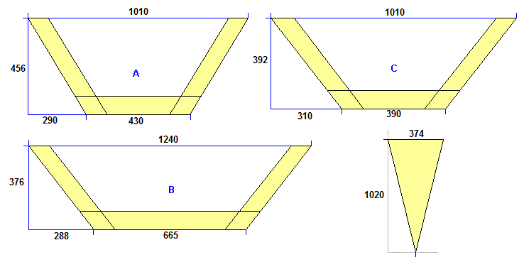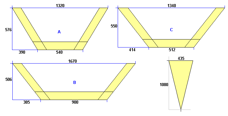 The measurements of the frames and transom. These are for the lower bow version (see below). For the higher bow version just extend the sides of frame A by 100 mm, and finally cut flush with the gunwale.