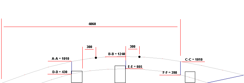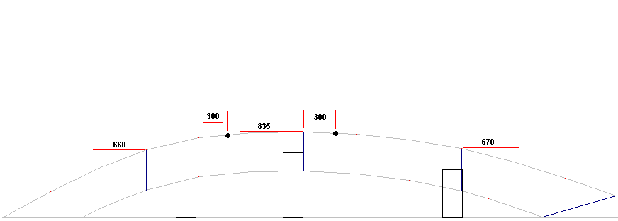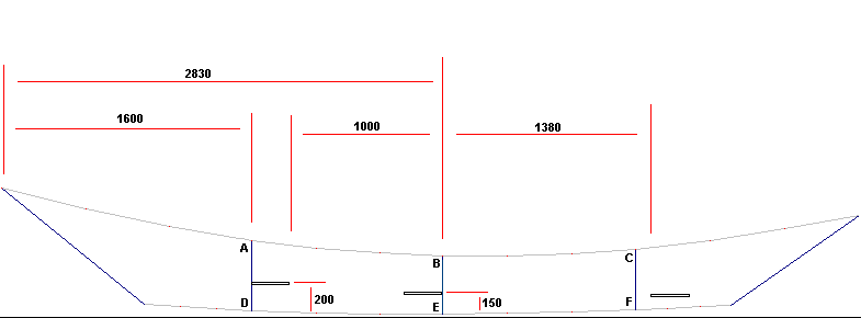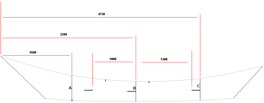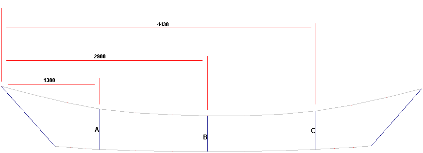 The measurements for the bottom and transom (mm). The frame loactions are marked in blue: