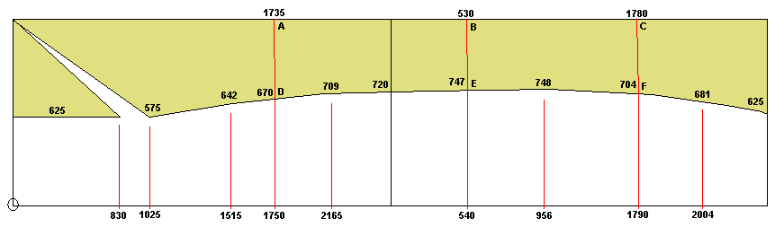 The measurements for the bottom and transom (mm). The bottom is symmetric, so the same measurements apply for both the bow and stern: