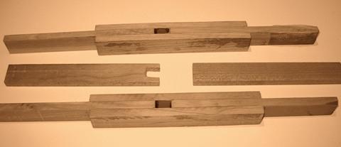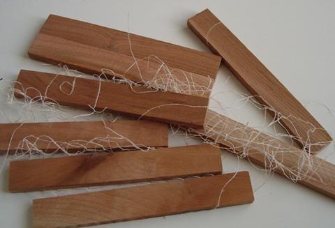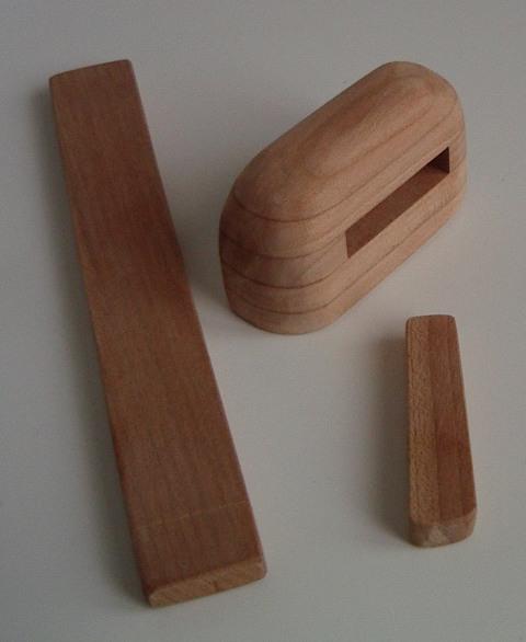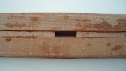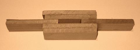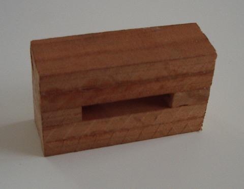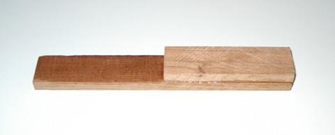 Sahaa kolme parkettipalikkaa puolikkaiksi. Liimaa palaset kuvan mukaisesti yhteen siten, että keskelle jäävän reijän leveys on noin puolitoista palikanleveyttä, tai vähän päälle. Reijän sivut ovat parkettipalikan suoria tehdaspäitä. Toisen näistä päistä voi viilata hieman (ehkä 0.5 mm) vinoksi, kiilavasteeksi. Tai liimaa toinen palikka aavistuksen verran vinoon. |