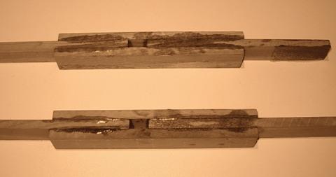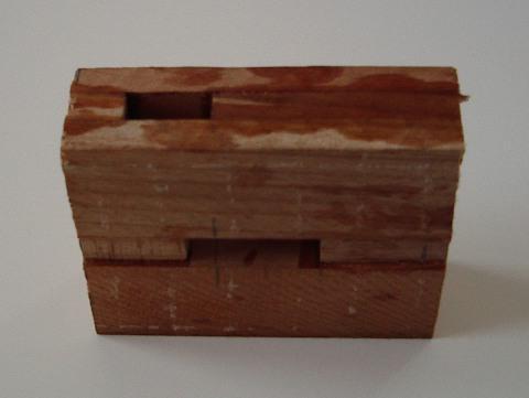 Kun liima on kovettunut, hio kummastakin palikkapaketista yksi sivu sileäksi, seuraavan vaiheen liimapinnaksi. Koverra yhden lisäpalikan päähän "haarukka, joka on noin 1/2 palikan leveyden syvyinen. Tarvitset toisenkin lisäpalikan. |