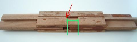 Liimaa kaksi palikkapakettia, haarukkapalikka ja suora palikka yhdeksi paketiksi siten, että haarukkapalikan haarukan posket muodostavat kiilareikään seinät (punainen nuoli). Ja haarukkapalikan ja suoran palikan päiden väli on naftisti yli palikan leveyden (vihreä väli). Tästä muodostuu piirtoaisan reikä, jossa piirtoaisa mahtuu juuri ja juuri liikkumaan. |