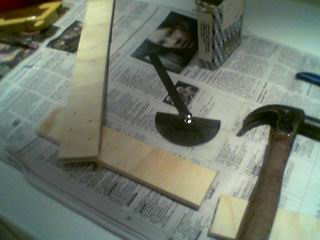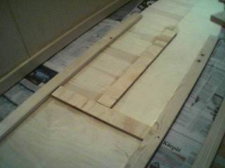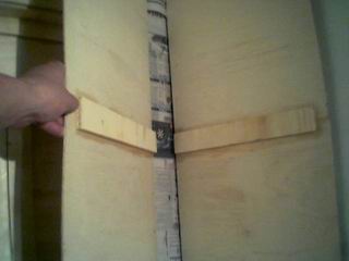 |  | Assemble the bottom with chine logs planed to 60 degrees. Suitable material to start with is about 1"x1.5". The length of each strip is 49" (125 cm). Spruce is my preferred wood here, because of the light weight. Yes, of course You can use tape and glue chines. Would look much better. But not really with the 4 mm plywood. It is too flimsy, very hard to keep the chines straight. Anyway, I'm heading towards a light weight boat, and a combination of 4 mm ply plus spruce chines adds up less than doing it with 6.5 mm (1/4 ") ply and glass tape chines. Btw, from here on the pictures have been taken with a Nokia 7650 multimedia phone. Although a nice toy, it is not a substitute for a real camera, as You can see :-( |