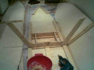 |  | Bend the plywood ends together, glue and nail to the bottom chine logs. Yes, You could say I'm cutting corners. Chine logs for the straight portions of the chine and tape and glue for the bends. But I call it light weight and ease of construction. I'm not preparing this prototype for a boat show, just a proof of concept. Fill the open seams from the inside. |