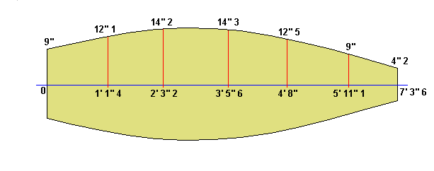 First draw a line lengthwise in the middle of the plywood sheet. From this centerline, measure and mark the bottom on one end of the sheet according to these measurements. Loft the side curve on one side only. Just mark the measurements with small dots on the other side.