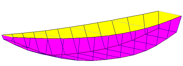 This is a one sheet version of the same punt, adjusted to be made of just one sheet of plywood. As it happens, the boat scales down very nicely. The overall shape is conserved beautifully. Both length and beam are 3/4 of the original, so the L/B ratio is the same, about 2.2. The shape looked from above is the same. The height is 4/5 of the original, so the "Micro" is proportionally slightly higher than the original "Auray". The total volume is 0.45 times that of the original, so if the original is a boat for 2 to 3 people, this is a one person boat.