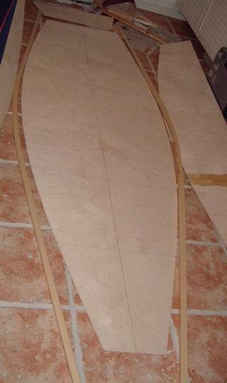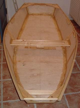 Sides butted with glass tape on either side of the ply and gunwale battens bent with the help of a heat blower gun. |