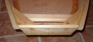 Bow details. The bow transom and quarter knees are of 70 x 12 mm (3" x 1/2") pine. The cross member of 45 x 21 mm (1 3/8" x 7/8") pine is not a necessary item, it's a handle. It can be left out. In my opinion boats always have too few handles. The cross member provides an excellent handle to carry or drag the boat. In addition, it increases the torsional stiffness of the "snout". |