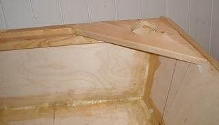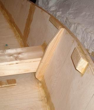 Wood and epoxy work finished, but not sanded yet. Up to here I used much the same techniques as with the "Simbo". Small wooden blocks and screws through the plywood for stitching the pieces together.