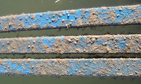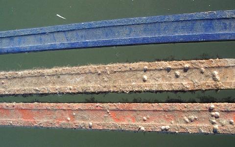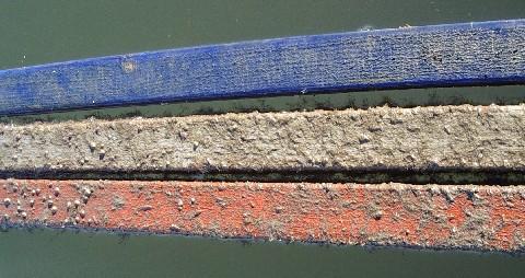|  | Varjon puolella kasvoi muutama näkki. Mutta varjon puoli oli myös tullut samantapaisesti ruskeanlaikukkaaksi, kuin muut maalinäytteet olivat olleet kaksi kuukautta sitten. Olisikohan niin, että Tehosta on neljässä kuukaudessa liuennut niin paljon tolyylifluanidia, että suojavaikutus on mennyt, ja näkit alkavat nyt kiinnittyä pintaan? Oli miten oli, suojavaikutus kesti juuri ja juuri veneilykauden. |