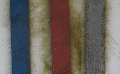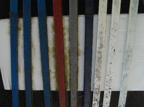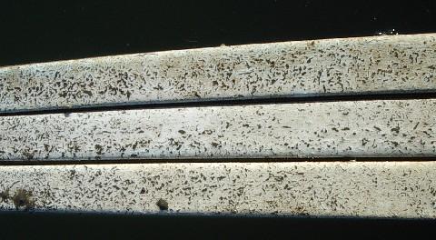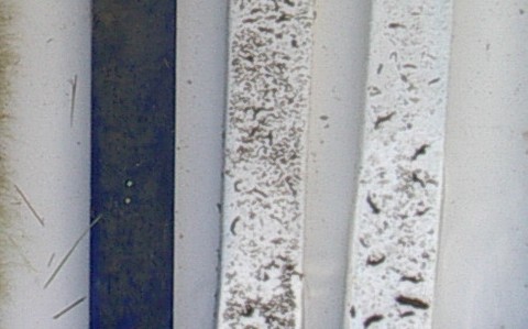 |  | Keppien takapuolella, jota voisi sanoa keppien pimeäksi puoleksi tai keppien alapuoleksi, ei kasva levää, vaan jotain muuta. En osaa vielä sanoa mitä kasvusto on, nuoria näkkejä kenties? Ruskehtavia puusta kohollaan olevia kasvustoja joka tapauksessa. Tätä kasvustoa on eniten, siis huonoin tulos, Ferrex "ruosteenestomaalissa", toiseksi eniten kaikissa Miranolnäytteissä, jonkin verran Ferrex "aktivoidussa lyijymönjässä". Mutta ei silminhavaittavasti Hempel's Mille Dynamicissa eikä taaskaan, taas yllätys yllätys, missään Teho-näytteessä. |