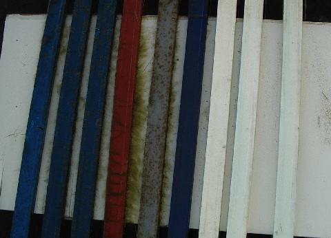 |  | Ja näkyyhän sitä. Tämä on testikeppien se puoli, joka näkyi laiturin ulkopuolelle ja johon nouseva aurinkokin paistaa. Ferrex "aktivoitu lyijymönjä" on surkein myrkkymaalin korvike, siinä kasvaa eniten levää. Ferrex "ruosteenestomaali" ja Miranol maustamattomana ja maustettuna kasvattavat suunnillen saman verran levää kukin, noin puolet "aktivoidusta lyijymönjästä". Hempel's Mille Dynamic ja, yllätys yllätys, Kaikki Teho-vaihtotehdot ovat puhtaita levästä. Valko- ja cayennepippurilla ei näytä olevan mitään vaikutusta levän kasvuun. |