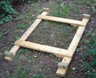 The frame will be held in place by the U-shaped pieces of plank on the underside of the frame. These pieces need to fit exactly over the ends of the roofrack bars. |