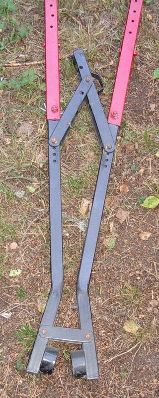 For the rear suport frame You need a bike rack that clamps onto a trailer ball. (You need to have a trailer ball on Your car.) Remove the bike support horns from the bike rack bars. Get two lengths of tubing that exactly fit on (or in, for a light weight version) the original bike rack tubing, to extend the height of the bike rack to reach the stern of Your boat on top of Your car. Bolt the tubing to the bike rack, through both tubings. |