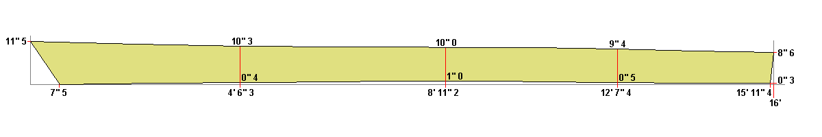 The bulkhead closer to the stern is 552 mm (1' 9" 6) wide on the top, 488 mm (1' 7" 2) at the turn of the bilge. Total height is 260 mm (10" 2), out of which 33 mm (1" 2) is the depth of the bottom V.