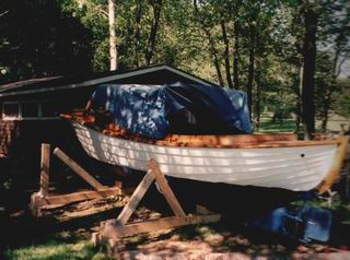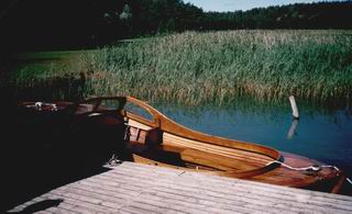 The lapstrake planking, decks and seats of pine, steam bent frames and stems of oak, deck details and windshield frames of mahogany.