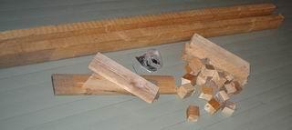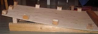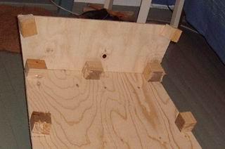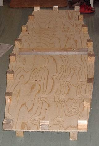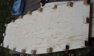 Ruuvaa 18 kakkoskakkosen pätkää pohjalevyn reunaan, aivan reunaan, noin 30 cm etäisyydelle toisistaan. "Palikkapuolesta" tulee veneen sisäpuoli, ruuvipuolesta ulkopuoli. Vanerilevyn puolet voivat olla erilaatuiset. Mieti tässä vaiheessa, haluatko paremman pinnan veneen sisä- vai ulkopuolelle. Tämä on nähdäkseni puhdas makuasia. |
