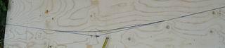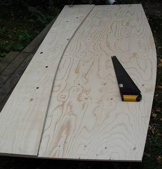 Merkkaa tulevan veneen pohjan reunakaari vaneriin riman laidan mukaisesti. Pysy koko ajan levyn keskustan puolella suoraa viivaa. |