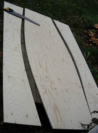 Sahaa levy kahteen osaan piirtämääsi kaarta pitkin. Ei kannata edes harkita sähköisen pistosahan käyttöä. Tavallisella käsisahalla voi aivan hyvin sahata näin loivan kaaren. Sitäpaitsi sekä kaaresta että sahausjäljestä tulee yleensä tasaisempi käsisahalla. Piirrä pohjalevyn toinen laitakaari irtisahattu laita sapluunana. |