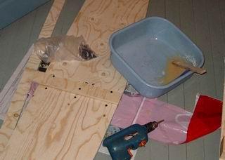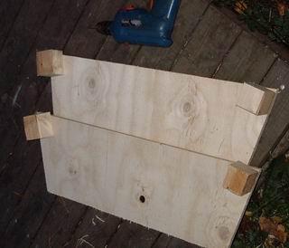 Yhdistä sivujen kappaleet liimatuilla tukikappaleilla. Tukikappaleiden pitäisi olla kymmenkunta senttiä leveät. Suojaa sauman ulkopuoli ilmastointiteipillä tai muovikassin suikaleella ja ruuvaa sisäpuolelta laudankappaletta vasten. |