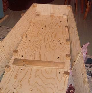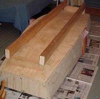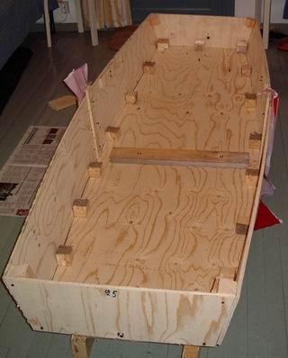 Tällaisen laatikkoruuhen ulkonäköä voisi parantaa huomattavasti ja yksinkertaisesti, näin jälkikäteen ajatellen, kallistamalla perä- ja keulalautoja. Keulaa ulospäin, perää sisäänpäin. Ainoa ero ylläesitettyyn on sivukappaleiden sahaus kahtia. Ei suoraan, kuten yllä, vaan vinosti.