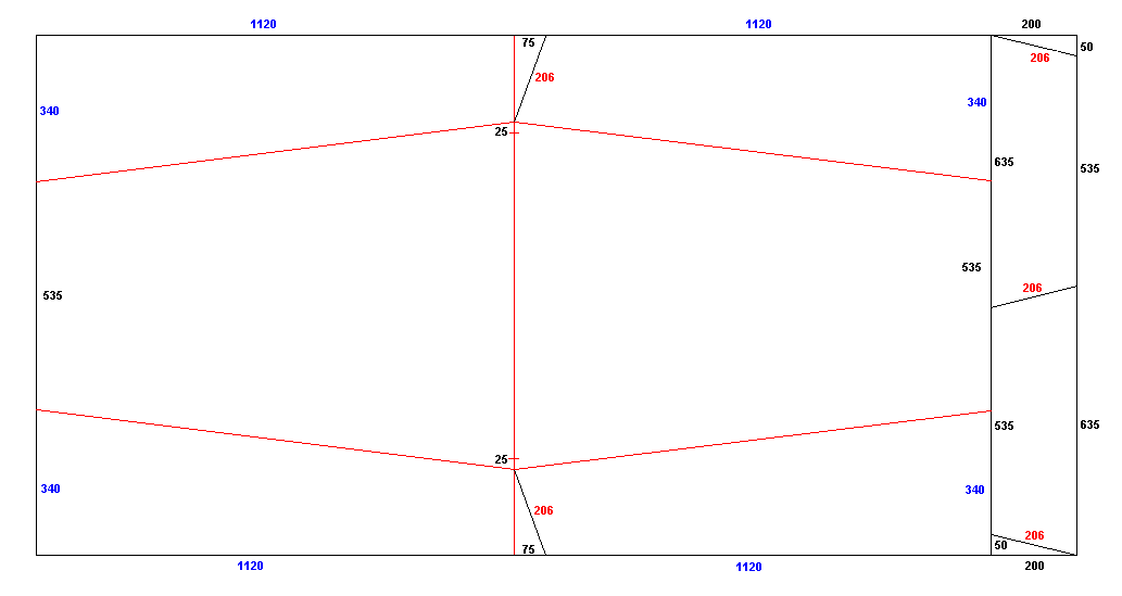 Mustat numerot ovat perusmittoja, siniset mitat osoittavat keskikohtia. Numeroarvot eivät ole oleellisia, vaan se, että mitat ovat pareittain yhtäsuuria. Punaiset mitat mitataan perä- ja keulalaudoilla.