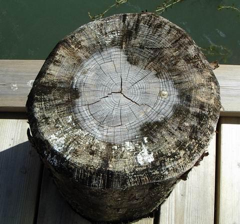 |  | A pine trunk used as a bridge pole. The difference between sapwood and heartwood is clear. Sapwood is infected with fungi, heartwood at least seems healthy. |