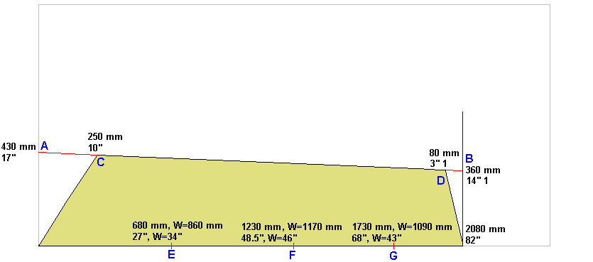 Then mark points E, F and G on the edge of the ply. The width of the hull will be set at these points using three lengths of board. The widths are marked on the drawing with the W=xxx notation. The board between points E should be 860 mm (34") long, ends cut at 66 degrees, the board between points F should be 1170 mm (46") long, ends cut at 65 degrees and the board between points G should be 1090 mm (43") long, ends cut at 64 degrees. If You don't feel comfortable with cutting the angles, forget about them. Just see that the distance between the sides of the boat at E, F and G are correct.