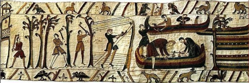 The tapestry describes the Norman attack perparations before the battle of Hastings in 1066. There was a great haste (hence the name Hastings? ;-). A great navy was needed yesterday. 600 ships were needed to carry 10-12000 men and 2500 horses across the English Channel. The longevity of the ships was of no consequence.