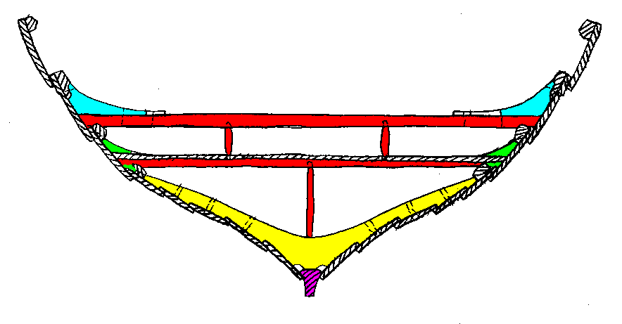 The keel (violet) is NOT attached to the lowest frame stub (yellow) at all. The other frame stubs are attached to planking by lashings or a single nail and lashings. But the frame stubs are not attached to each other.